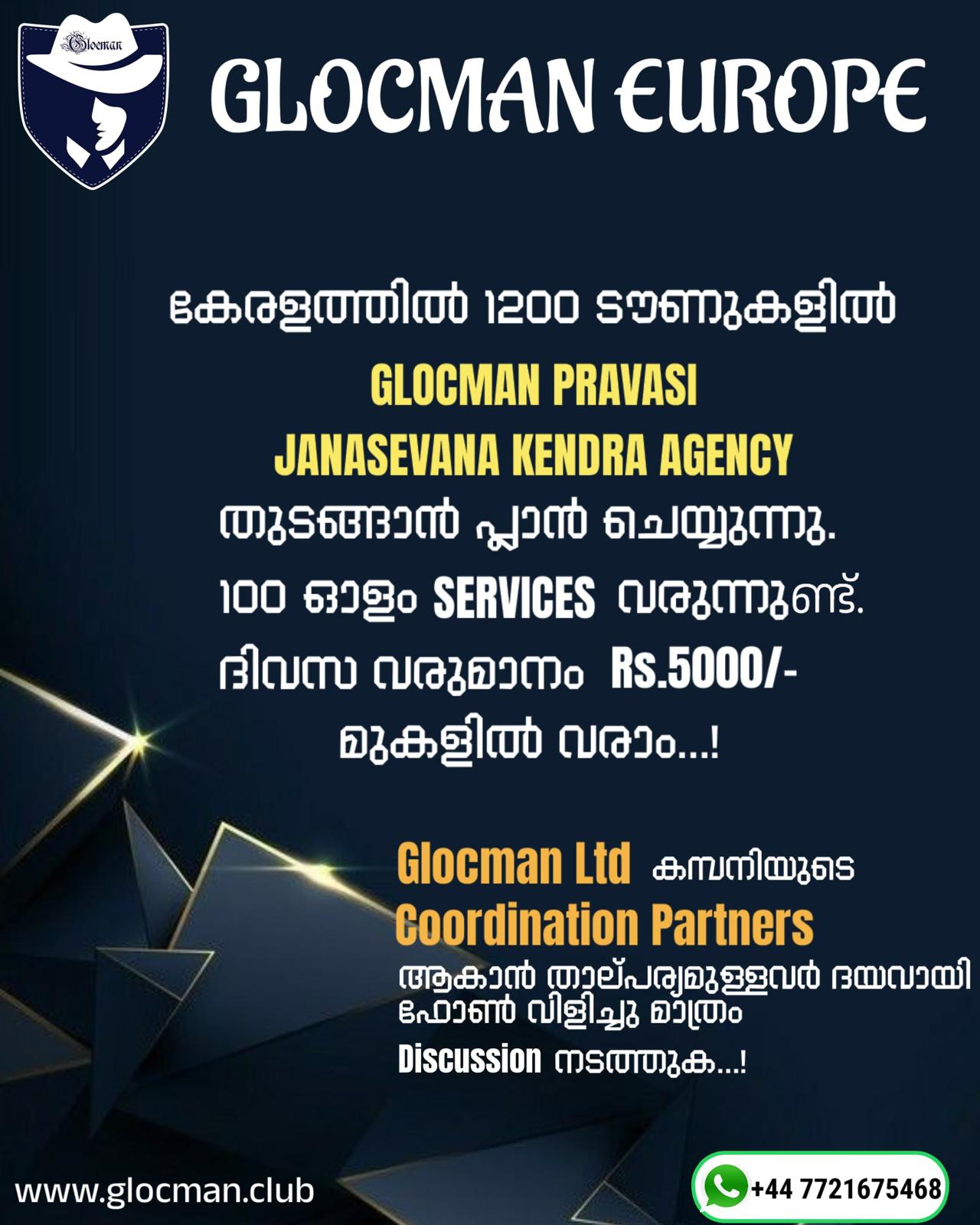 നാട്ടിലും Glocman network നു പ്രസക്തി യുണ്ട്. പ്രധാനമായിട്ട് പ്രവാസി മലയാളികളുടെ services ആണ്. പ്രവാസികളുടെ നാട്ടിലുള്ള property കൾ take care ചെയ്യുക, rent collect ചെയ്യുക, Birthday gift കൾ, festive gifts എന്നിവ distribute ചെയ്യുവാൻ നമുക്ക് എല്ലാ townwise franchise തുടങ്ങാനുള്ള plan ഉണ്ട്. Kerala products വിദേശത്ത് ഒരു market കണ്ടുപിടിക്കുന്നതിനും നമുക്ക് ഒരു നല്ല Network അനിവാര്യമാണ്. Glocman Ltd UK യിൽ ഒരു registered company ആയി work ചെയ്യുന്നു.